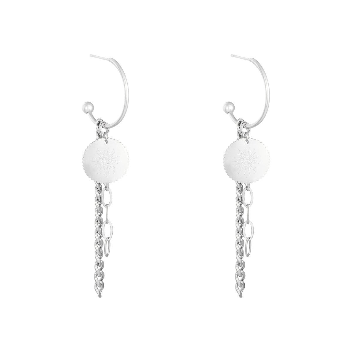 Oorbellen met hangende kettingen en een ronde bedel met afdruk. Deze mooie lange oorbellen maken elke outfit af!Materiaal:Stainless steel
